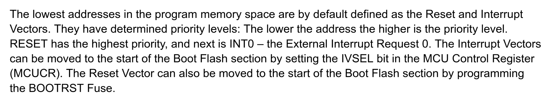"The lowest addresses in the program memory space are by default defined as the Reset and Interrupt Vectors."